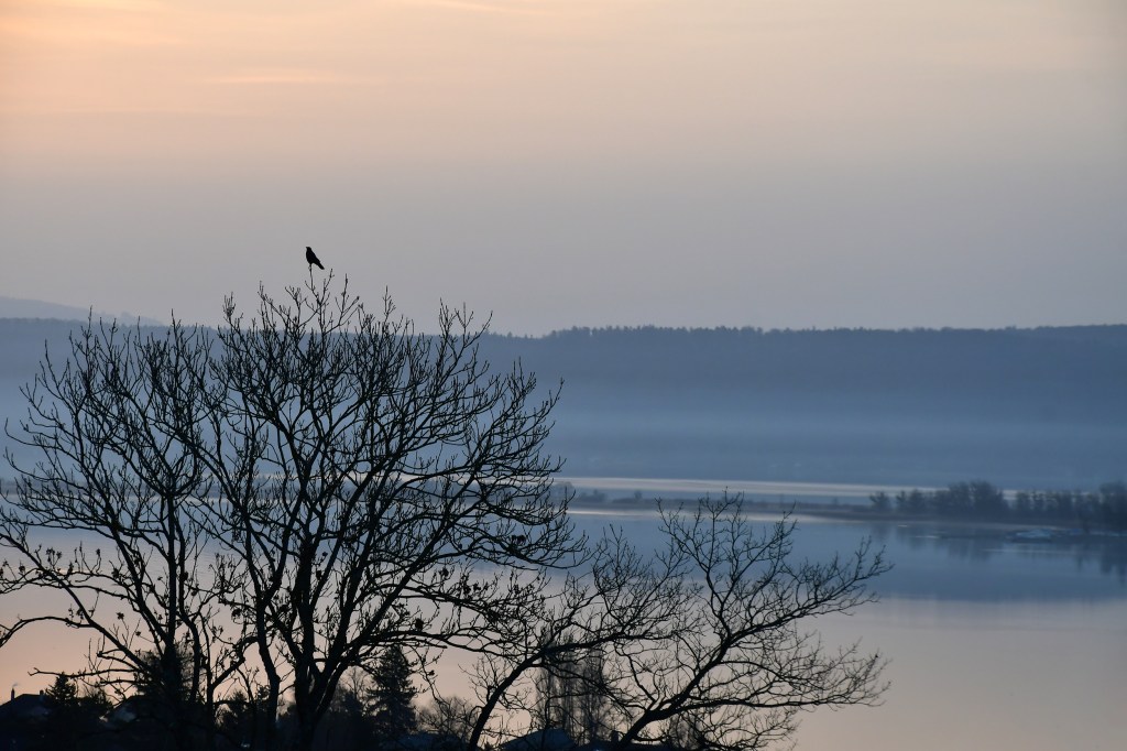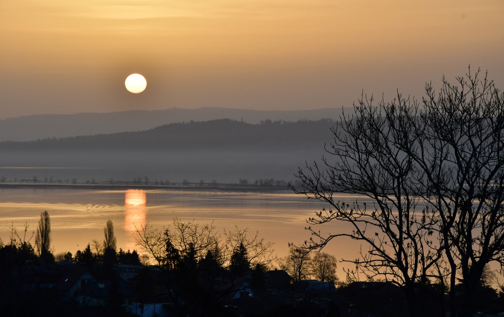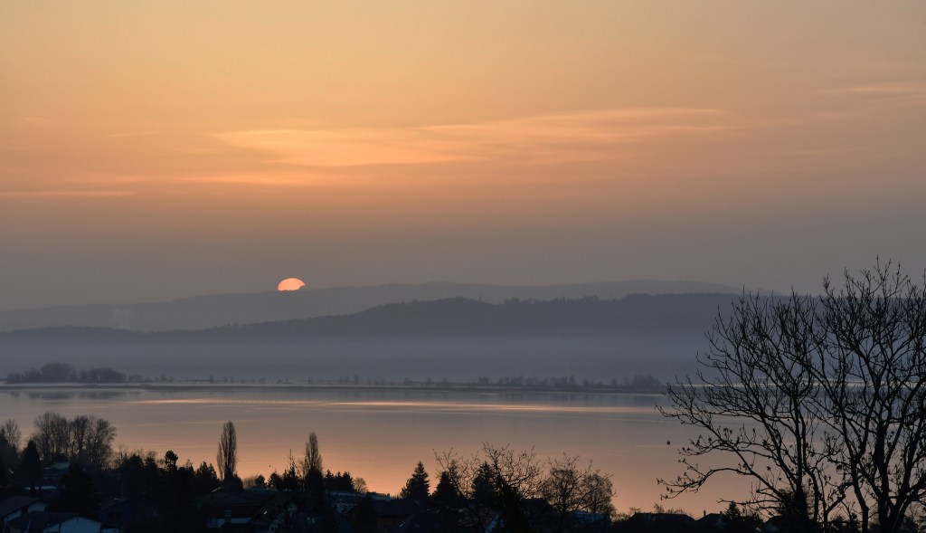 Les yeux encore brumeux, je quitte le plateau de Diesse et m’engage dans les lacets qui me mènent au vieux Bourg du Landeron. Je surplombe la cité. Il est 7h00 et à cette saison le soleil va bientôt se lever. Depuis quelques jours le ciel est empreint du sable du Sahara et apporte une note particulière aux couleurs du ciel. Je m’installe à côté d’un poulailler et j’attends. Et comme par magie, le voilà qui pointe le bout de son nez et du coup le coq se met à chanter…quelle symbiose.