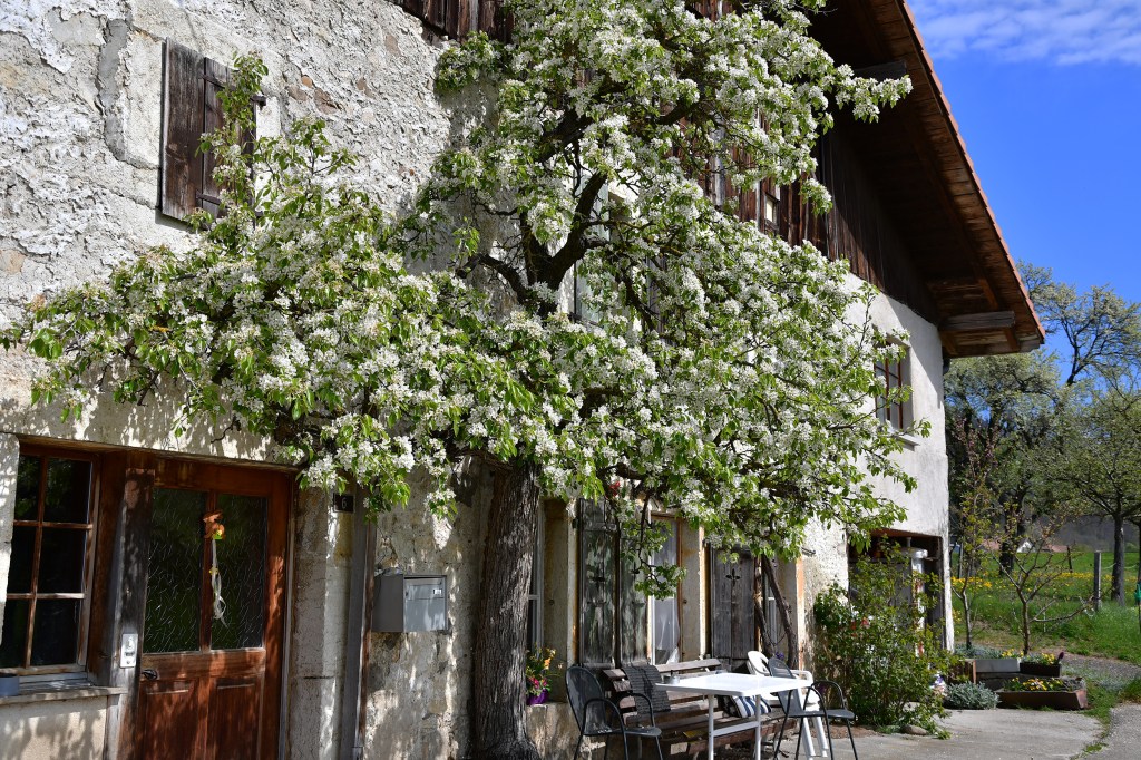 Nous quittons le très charmant petit village de Schernelz, longeons les vignes, surplombons le lac pour nous engouffrer dans les gorges de Twann. Assez rapidement, nous bifurquons direction Gaicht. Petit hameau perdu au milieu des pommiers et poiriers. Là, une terrasse est ouverte et nous profitons d’une petite halte désaltérante et gustative.
