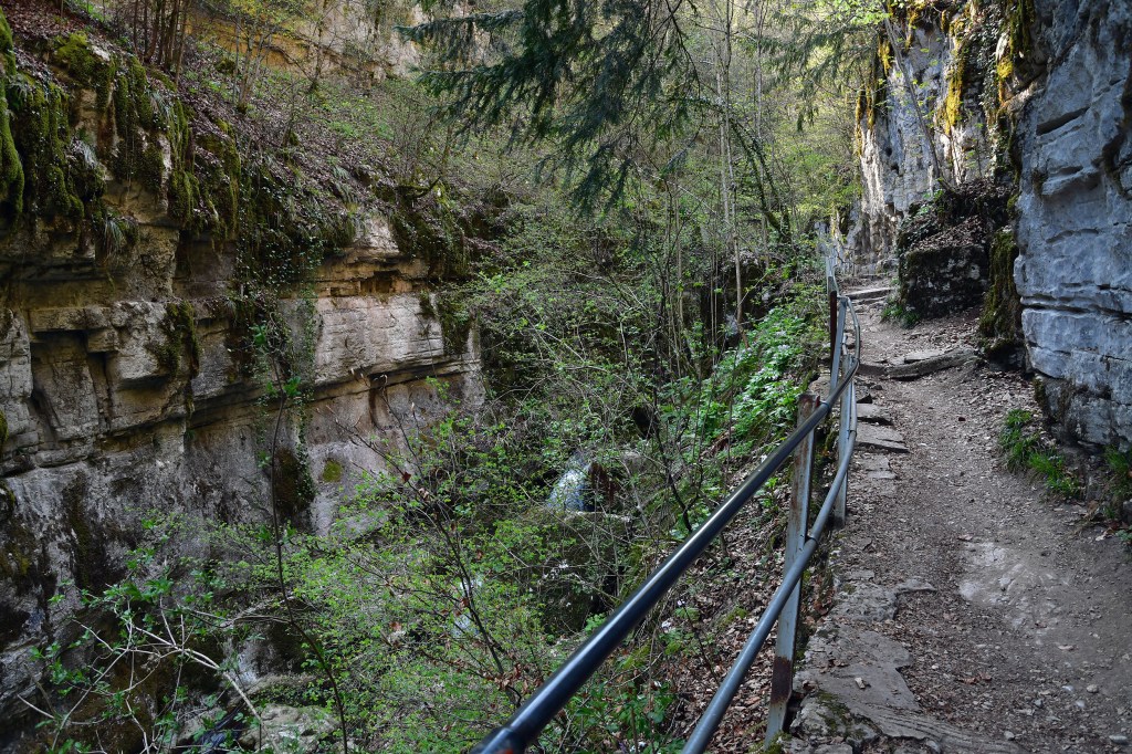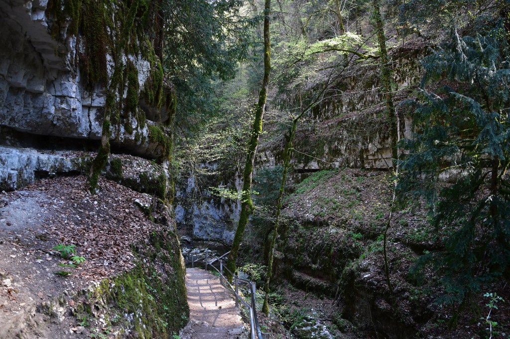 Nous poursuivons la balade en direction de Twannberg. Le chemin grimpe abruptement au milieu de la forêt mais désolation, une coupe immense a été faite, la moitié de la forêt est au sol amassée en tas. Après une petite halte au sommet nous reprenons notre chemin en direction de l’entrée supérieure des gorges et nous nous arrêtons à l’atelier de verre. La cabane d’Ali baba ! Cela vaut le détour. Le patron fait ses glaces et sirops à base de plantes locales et de saison. Il souffle le verre et vend ses créations, il y a des créations dans tous les coins. Sa femme crée des bijoux avec des plantes séchées coulées dans la résine, c’est très joli. On y trouve aussi une grande variété de pierres taillées et brutes.