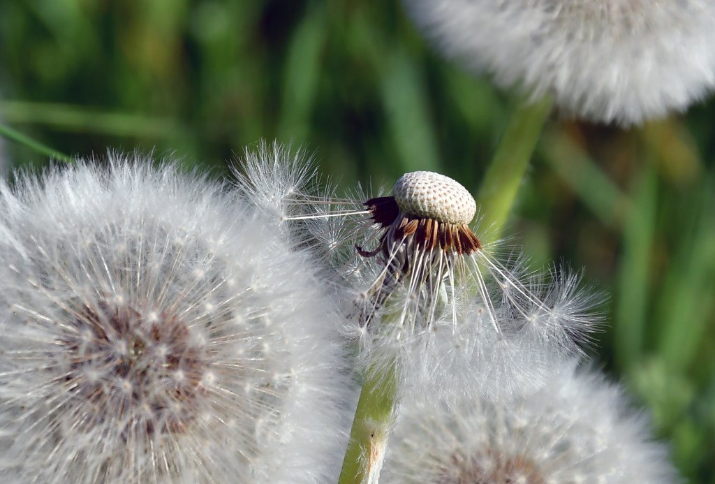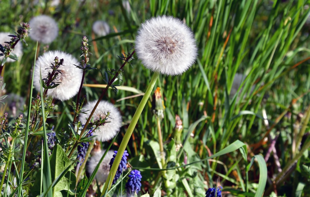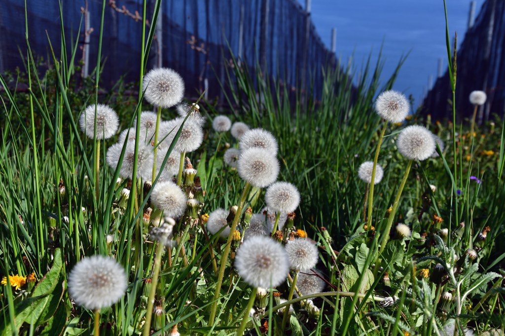Nous terminons notre parcours dans les vignes et nous arrêtons pour photographier une dernière fois la farandole de pissenlits déjà en ombelles blanches.