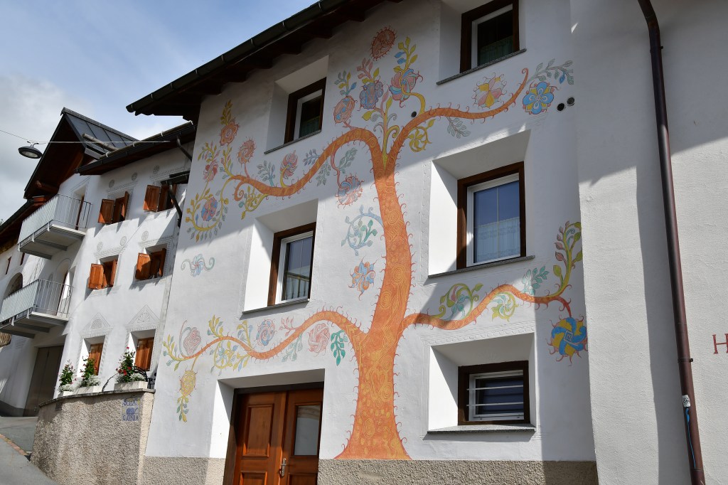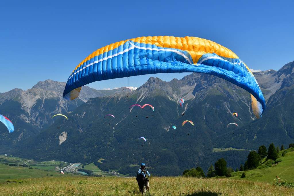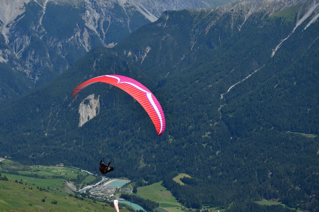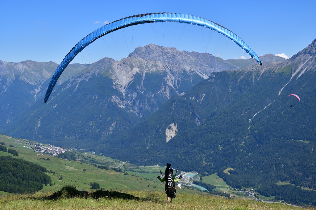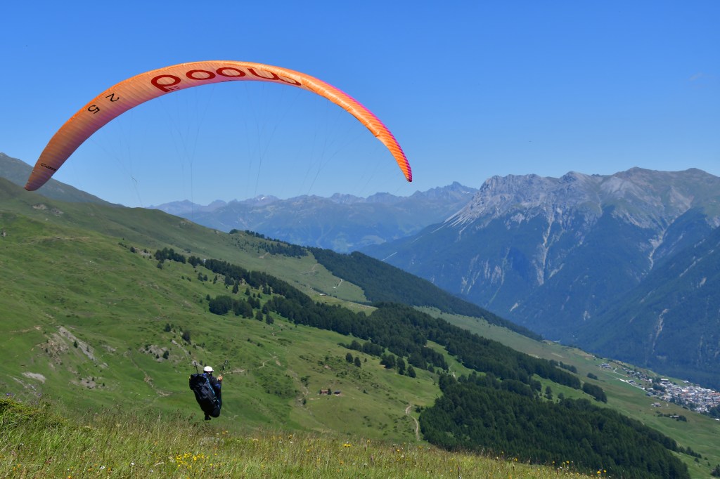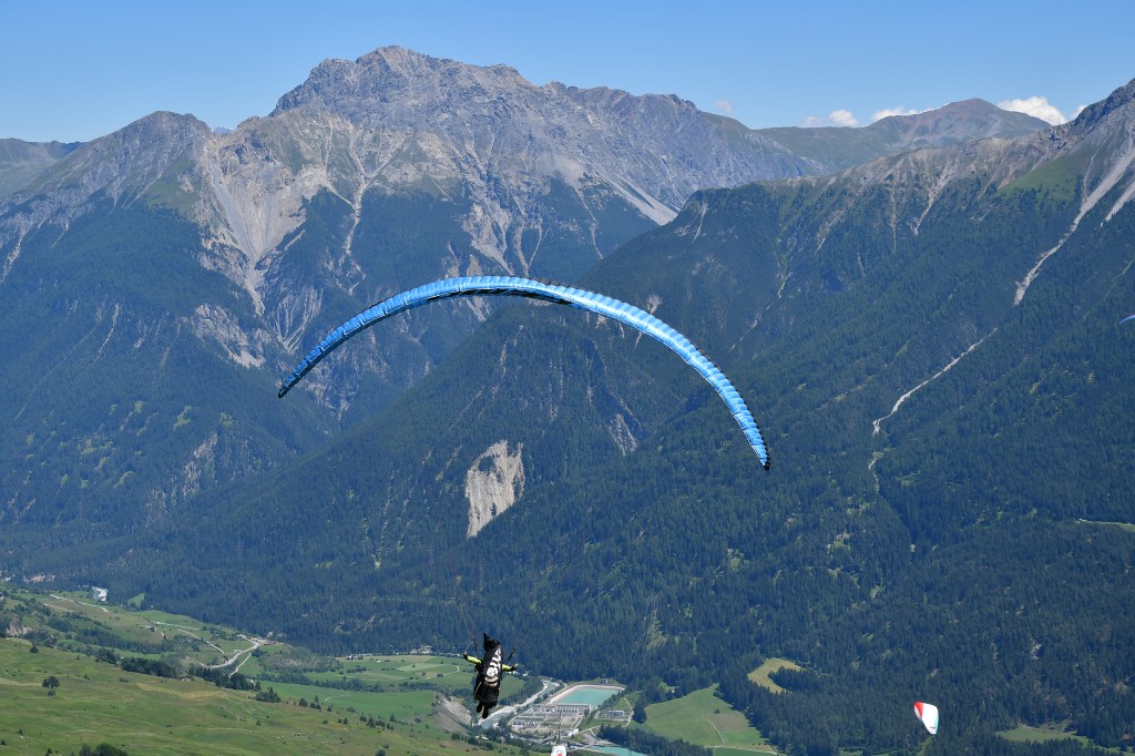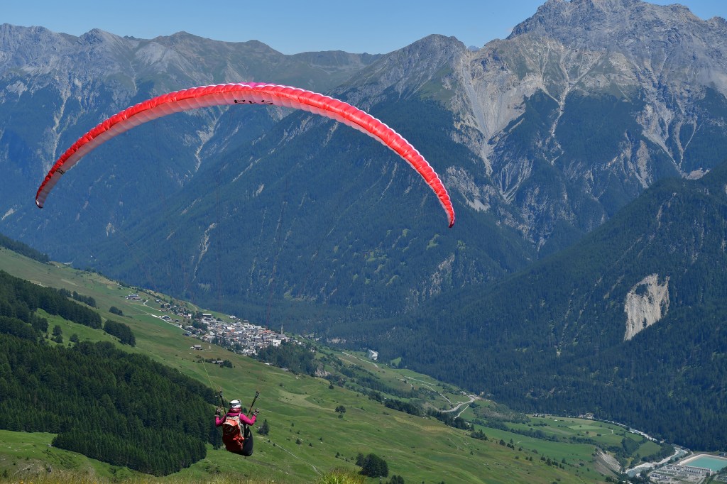 J’ai décidé de suivre mon oiseau lors de sa participation au championnat suisse de parapente qui se tenait à Scuol et j’ai bien eu raison. Scuol, petite ville située au fin fond des Grisons, en Engadine ayant comme voisins l’Italie et l’Autriche et aux abords du parc national suisse. Les maisons de la vieille ville sont teintes de « Sgraffiti » artisanat traditionnel qui date du 17ème siècle qui donne un charme inégalable à cette ville.